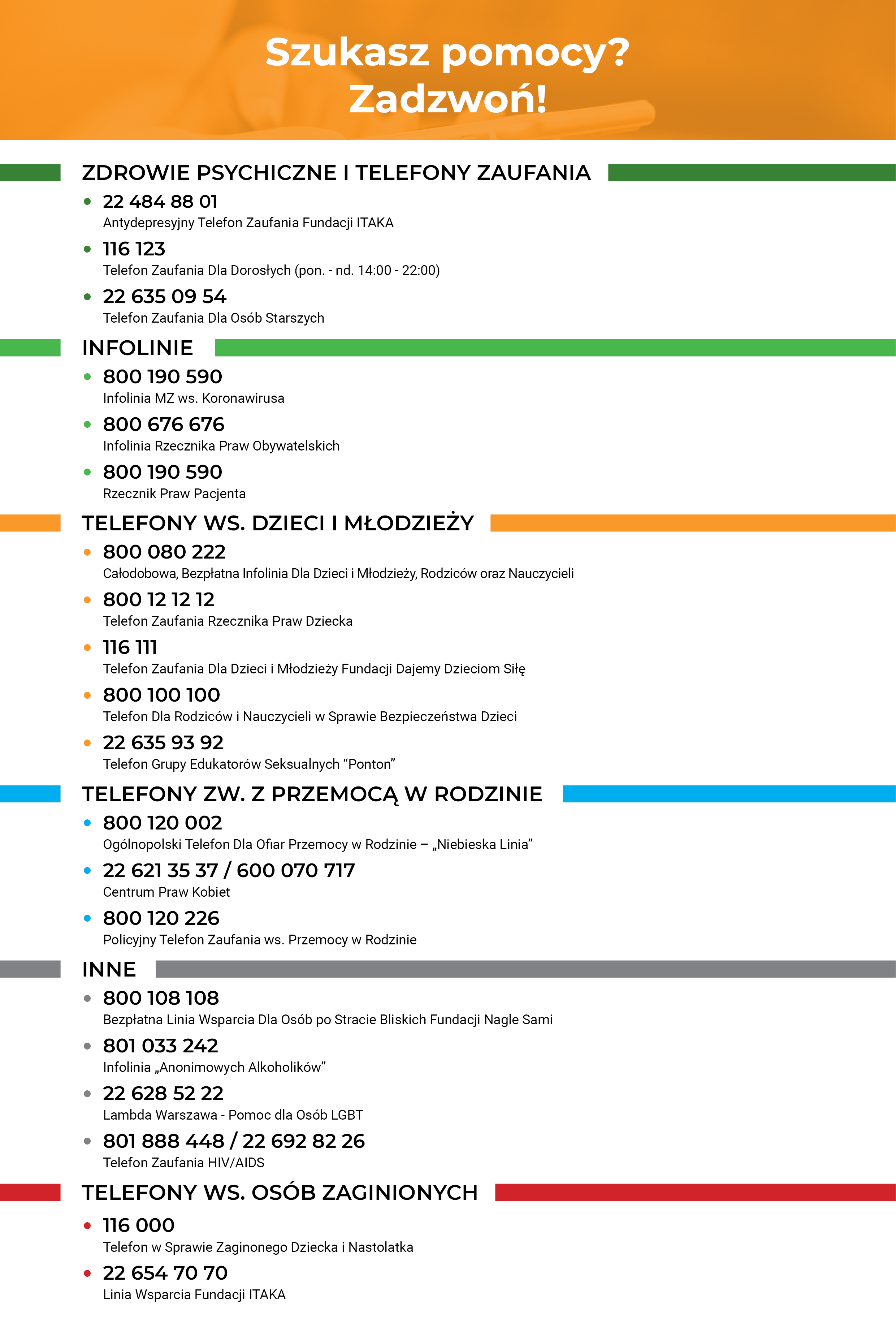 24 godziny na dobę 7 dni w tygodniu, Telefoniczne Centrum Wsparcia 800 70 2222. LINIA JEST BEZPŁATNA.