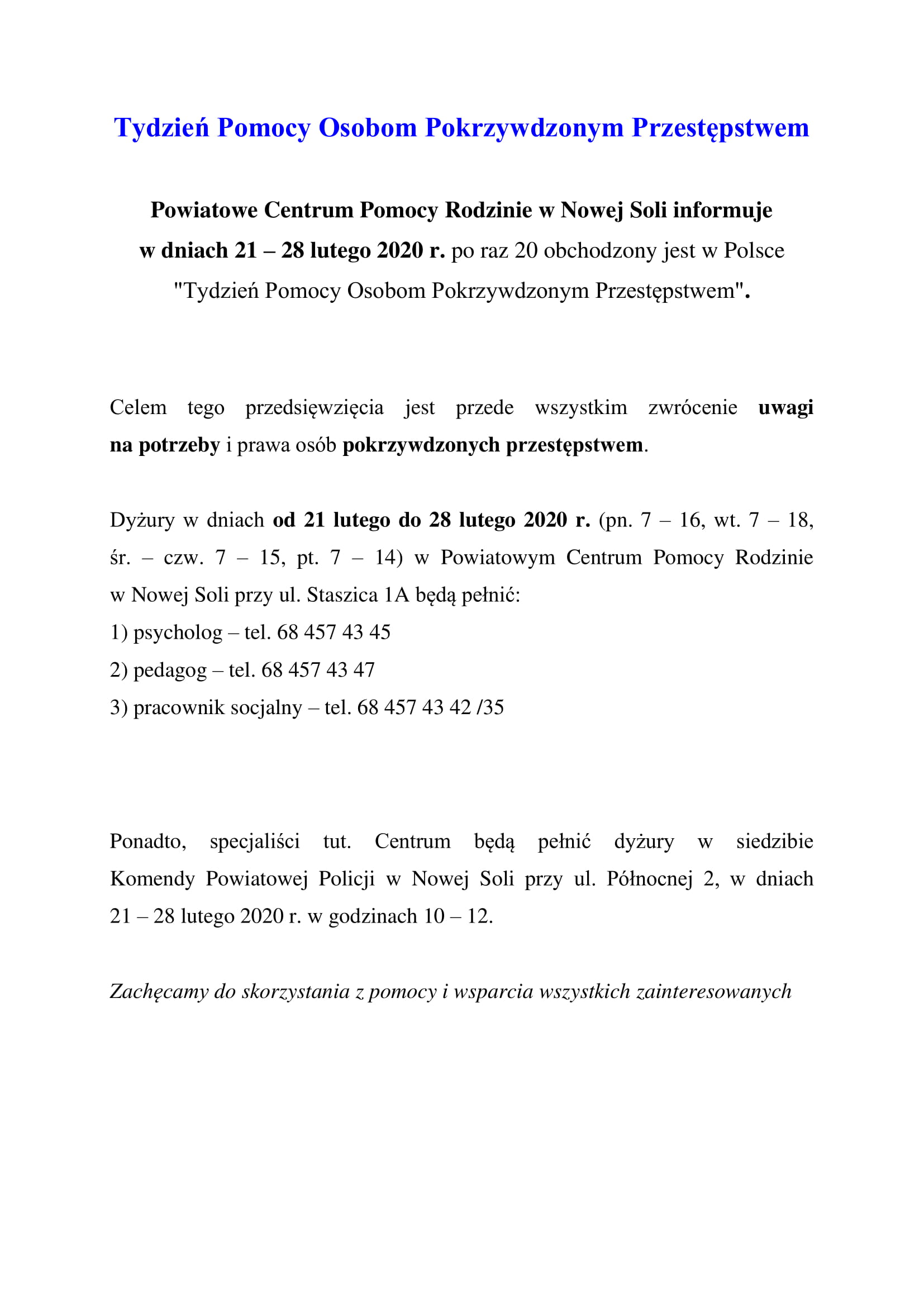 Powiatowe Centrum Pomocy Rodzinie w Nowej Soli informuje, że w dniach 21 – 28 lutego 2020 r. obchodzony jest w Polsce "Tydzień Pomocy Osobom Pokrzywdzonym Przestępstwem".